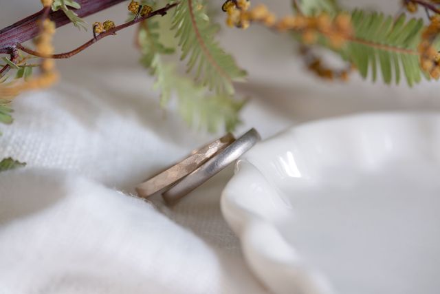 非常にシンプルなのですが、レディースは半面だけ槌目を入れテクスチャーを変えていただき、フォーマルでもカジュアルでもどちらの場面でも楽しめるようなデザインにしていただきました。