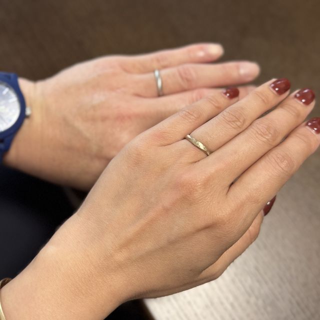 素材をはじめ、ベースとなるデザインやテクスチャー、石の配置、指輪の太さ、内側の刻印など素敵な組み合わせが多数ありたくさん悩みました。悩み抜いた末とても素敵な指輪が出来上がりました。毎日眺めて嬉しくなっています。