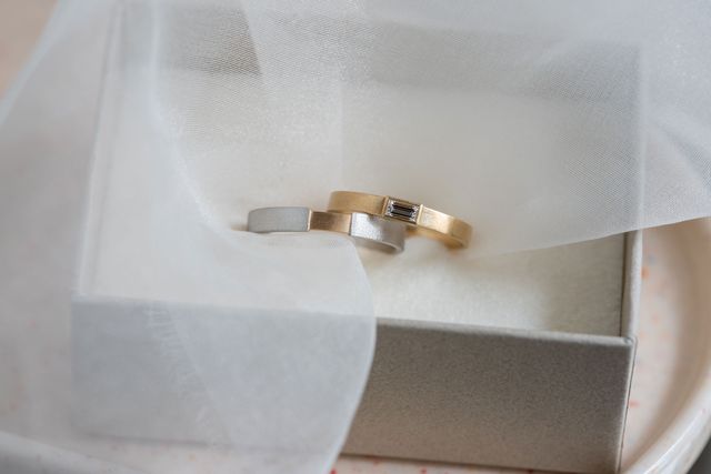 シンプルすぎず、人と被りづらいデザインが気に入っています。ベースは同じデザインだが、素材や石の有無などそれぞれの希望も反映させながらペア感を出すことができました。日常にも馴染みやすく、着け心地も良いです。