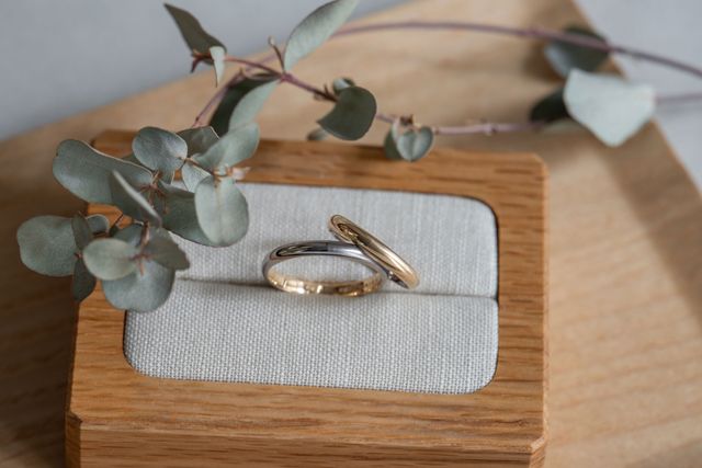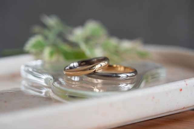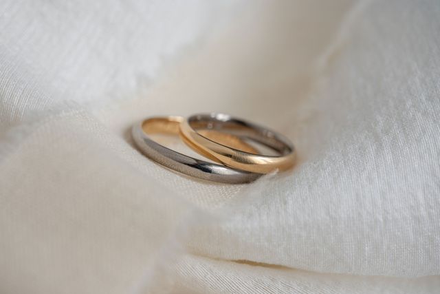 夫婦でそれぞれカラーにこだわりがありましたが、指輪の表側は自分のカラー、裏側は相手のカラーとすることでペア感を出すことができました。また、質感もお互いのこだわりがあったため、半分をマット加工、半分を光沢としています。二人の希望が反映された指輪ができ大変満足しています!また、私は指輪を着けた経験がなく、着け心地にかなり不安がありましたが、リングの角を丸く削る内甲丸としたことで、着用感も非常に良い指輪となりました。