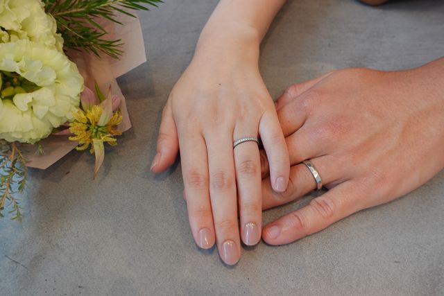 それぞれ異なるデザインで作成しましたが、テクスチャーを揃えることで統一感が出たのでとても満足しています。ミルグレインを全周にしたり、リング幅を調整するなど、一部アレンジもしていただきました!着け心地も非常に良いので、日常でも違和感なく着用できそうです。