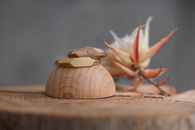 結婚指輪らしくない、ナチュラルに着けられる指輪にこだわりました。印台のあるデザインとブラシマットのテクスチャーで2人の希望を実現することができました。イエローゴールドとシャンパンゴールドで少し表情が変わるのも良いです◎
