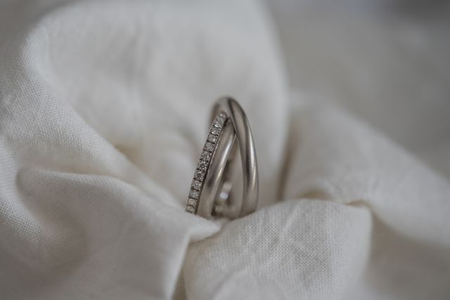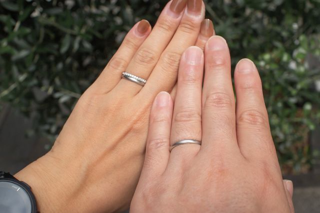 彼が普段アクセサリーをつけないので、シンプルな甲丸デザインと、私の方は婚約指輪も兼ねて二重になるデザインでお願いしました。