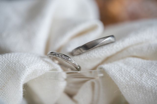 シンプルで歳を重ねても使い続けられるデザインに惹かれました。仕事中に着用しても馴染む様、旦那さんの指輪は使い込んだ様な質感の素材にして頂き、私はリングの太さをやや細身にして頂きました。