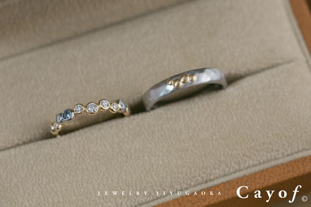 ハイブランドも見たのですが、あまりピンと来ず、せっかくなら世界にひとつだけの結婚指輪がいいねということになり、オーダーをお願いしました。オリジナリティあるデザインを大変気に入っています。少しレディースのデザインが派手だったので、裏側をシンプルにしてどちらでも使えるようにしたのがポイントです。