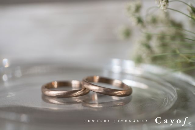 クラフト感のある叩き加工、手に自然に馴染む色味のシャンパンゴールド、光の当たり方で表情が変わるテクスチャを取り入れて作っていただきました。