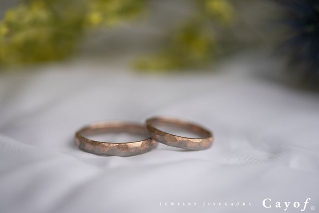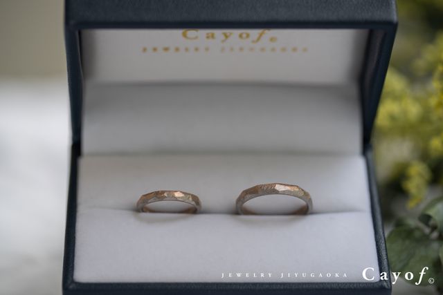 デザインのテイストが好みだったのと、店舗が家から近かったため、このお店にしました!細かいところまで自分たちでデザインを決められたので満足のいく仕上がりになりました。サンプルを作っていただけてサイズ感やテクスチャなどを確かめてオーダーできました。素材は上下で分けて、テクスチャはダイヤモンドマットにしました。仕事柄、指輪が傷つきやすいのですが、傷の目立たないデザインにできたので仕事中もずっと指輪をつけていられます!