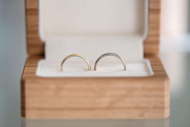 選べる素材が王道のプラチナやイエローゴールドだけでなく、シャンパンゴールド・ピンクゴールド・グリーンゴールド・グレイッシュゴールドと多く、表面の加工も複数パターンあったので、自分達の意見を反映させやすく人と被らない。