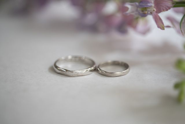 HPを拝見して、手作業ならではの温かみ、柔らかいデザインに惹かれました。なんとなくで、これがいいかな?といくつか候補はあったのですが、実際に試着をしてベースのデザインはフリージアに。シンプルだけど動きがあって、自分たち好みのアレンジが楽しめるかなと思い、悩みに悩んで決めました。