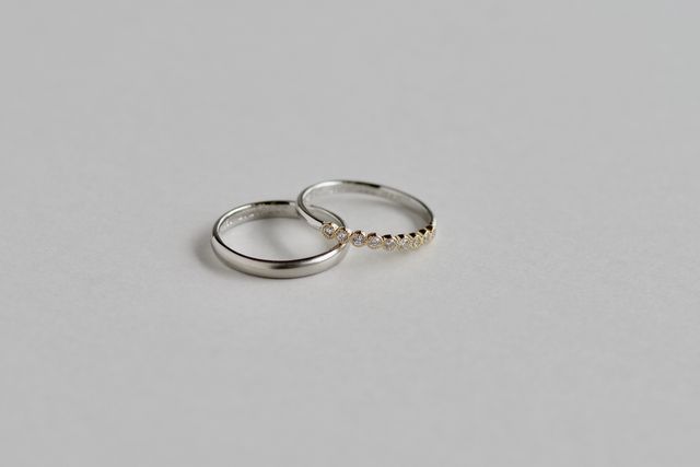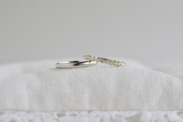 なお、女性用はフルオーダーで、ミルグレインを施したハーフエタニティリングを台座部K18+残り半分の脚部分はプラチナ鏡面でお願いしました。男性用はセミオーダーのシンプルなプラチナリング(無料オプションとして磨きを選べるので、女性用に合わせて半分は鏡面+半分はヘアラインというマット加工にしました)。