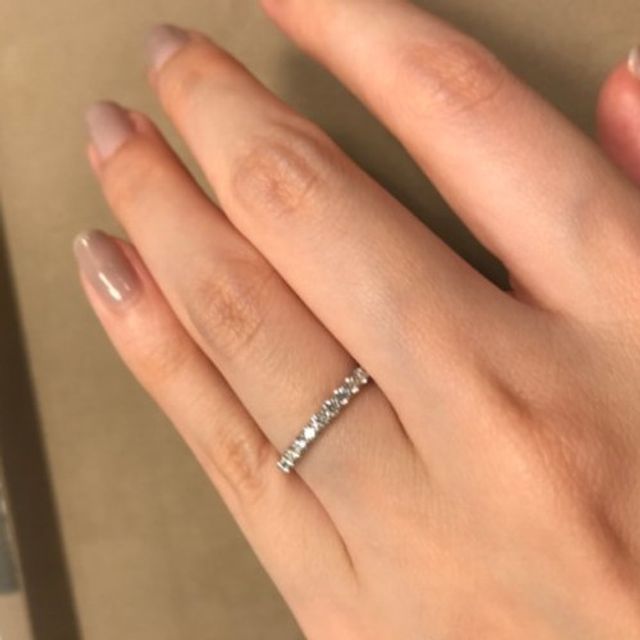 エレガントな印象のエタニティリングでありダイヤモンドの輝きが綺麗で存在感が十分であるのが決め手になりました。一つ一つのダイヤが連なっており大きなダイヤモンドにも見える点が素敵ですし、つけ心地も特に問題はないです。