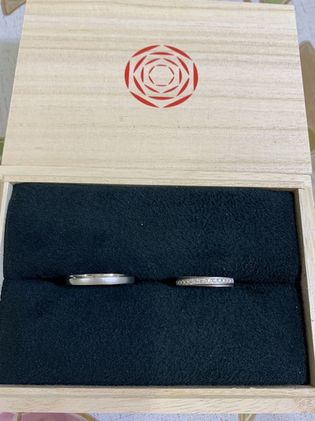時結という名前の指輪を選びました。風が流れるように、ダイヤモンドが配置されて、とても輝きがあります。指輪全体にホーニング加工してもらったため、ダイヤの輝きが際立ってます。主人の方も、風が流れるようにホーニング加工がはいっているため、そのグラデーションが素敵です。