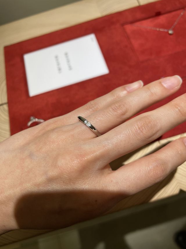 シンプルなデザインのため、身につける場所や、服装を選ばない指輪だと思いました。表面にダイヤが付いていますが、華奢なデザインのため、男性も同じデザインで、お揃いにして身につけることができるかなと思います。