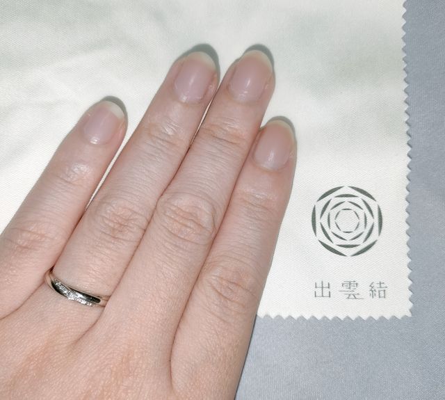 こちらのデザインはしめ縄をモチーフにされていることです。他にもシンプルなデザインや和を感じるデザインの指輪がありましたが、実際に着けてみてお互いにしっくりくるデザインだったため、二人とも気に入ってこちらを選びました。素材はプラチナ、夫はマット加工、私はダイヤ有りの艶があるタイプにしました。価格は12万円位です。