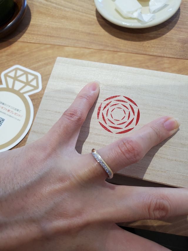 出雲という事で日本に纏わる場所に相応しい指輪ばかりで、1本の線で夫婦が繋がるの意味が入っている縁にしましたが、女性の指輪にはダイヤを入れる事も出来るし入れない事も出来る選択肢があるのがいいなって思いました。