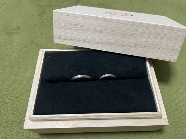種類が色々あり悩みました。ネットで確認していたものとは違うものを購入しました。当日お店でいろいろ試着させていただき、旦那と相談して決めました。形を決めた後も加工や刻印なども色々提案いただきました。最終選んだのはシンプルなデザインで、ずっとつけられそうです。