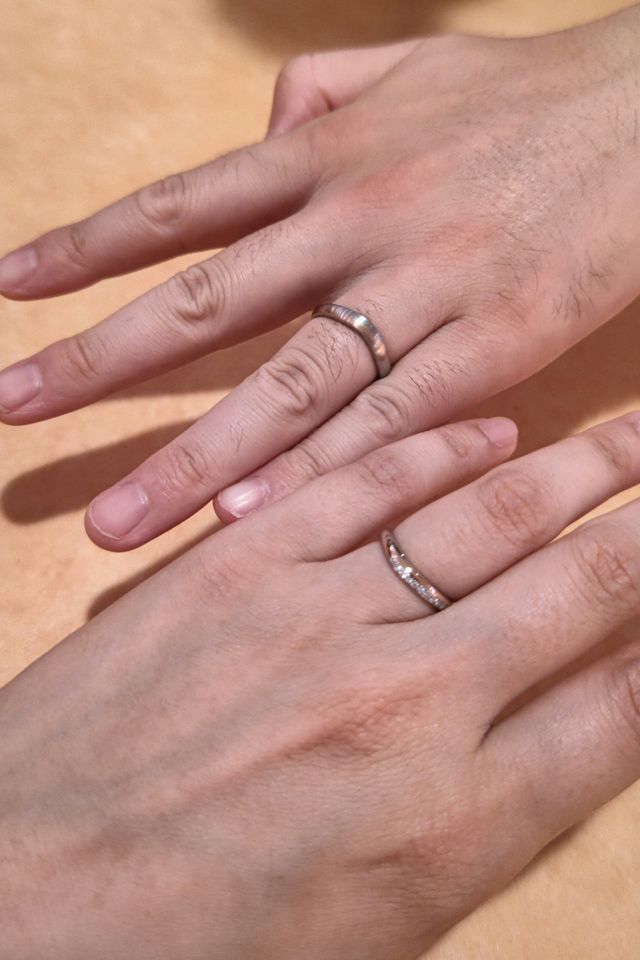 夫は普段全くアクセサリーを着けないので派手なデザインは苦手だと言っておりましたが、こちらのデザインはピンクゴールドのラインが入っているのにつや消しの加工がされており、華美になり過ぎないから着けやすいかもということでこのデザインに決まりました。