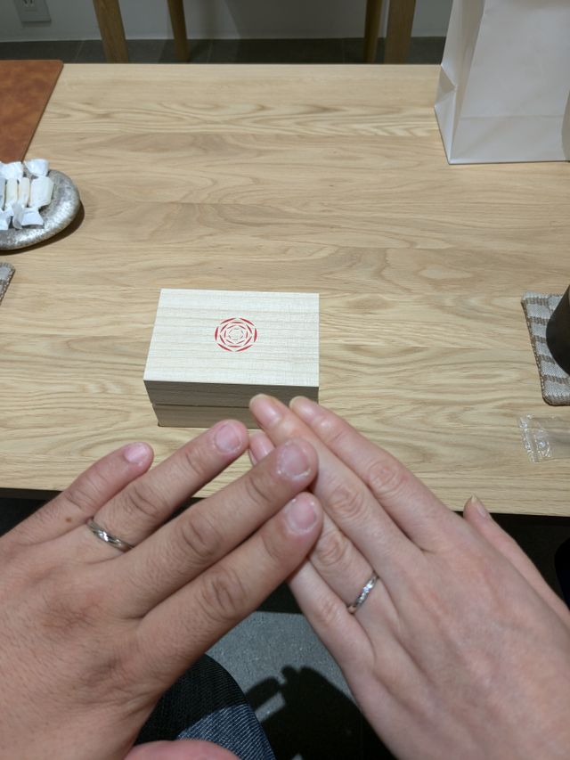 シンプルでデザイン良く、付け心地がとても良かった。一つ一つの指輪にこだわりがあり、想いがあるのが指輪を選んだポイントの一つでもあった。一生の想い出の指輪には間違い無い。ずっと付けていても常に新鮮な気持ちで見ていれる。