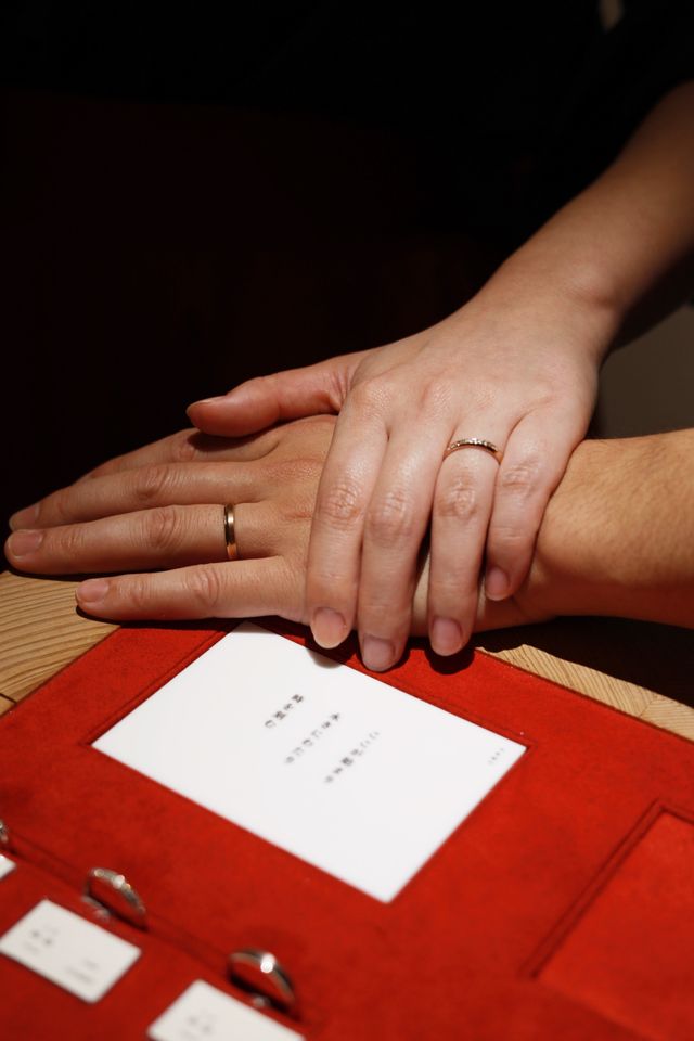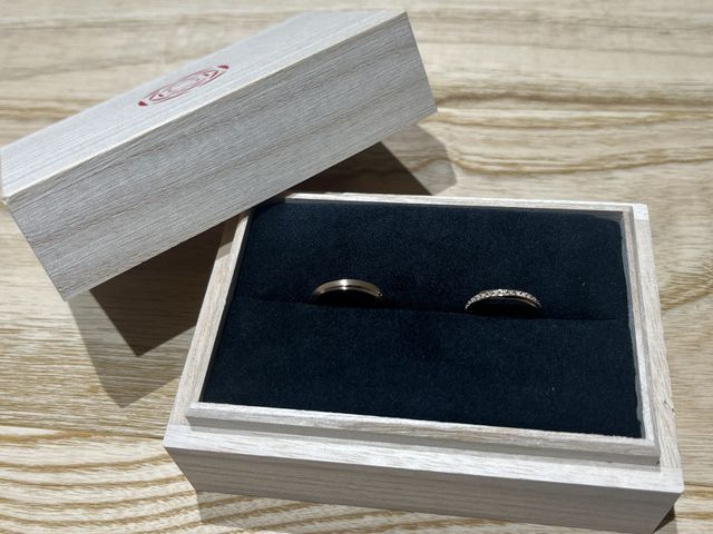 「- 時 結 - と き」というコンセプトの指輪を選びました。やや太めのリングですが、ラインやデザインが斜めに入っているのが珍しくもスタイリッシュに見えます。女性用は細かいストーンがライン上に散りばめられているのもおしゃれでとても気に入っています。