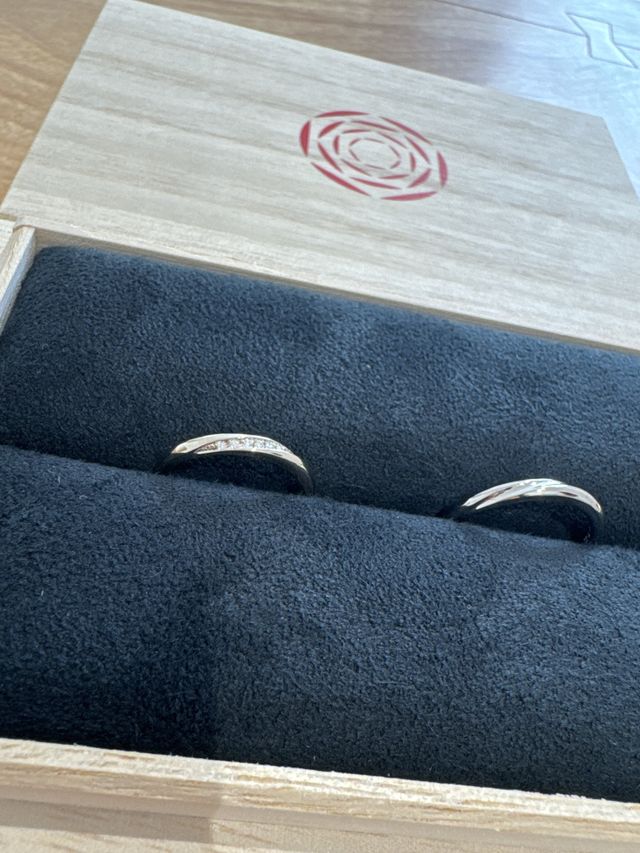 事前にサンプルを郵送してもらいました。最初のメールのやり取りやサンプルに入っていたメッセージでもとても丁寧ですごくいい方だなと思いました。店頭での指輪の相談も選ぶのに時間がかかりましたが、一緒に寄り添って考えてくださったり、すごく気持ちの良い対応をしてくださって、ここを選んで本当に良かったなと思いました。