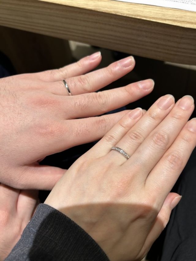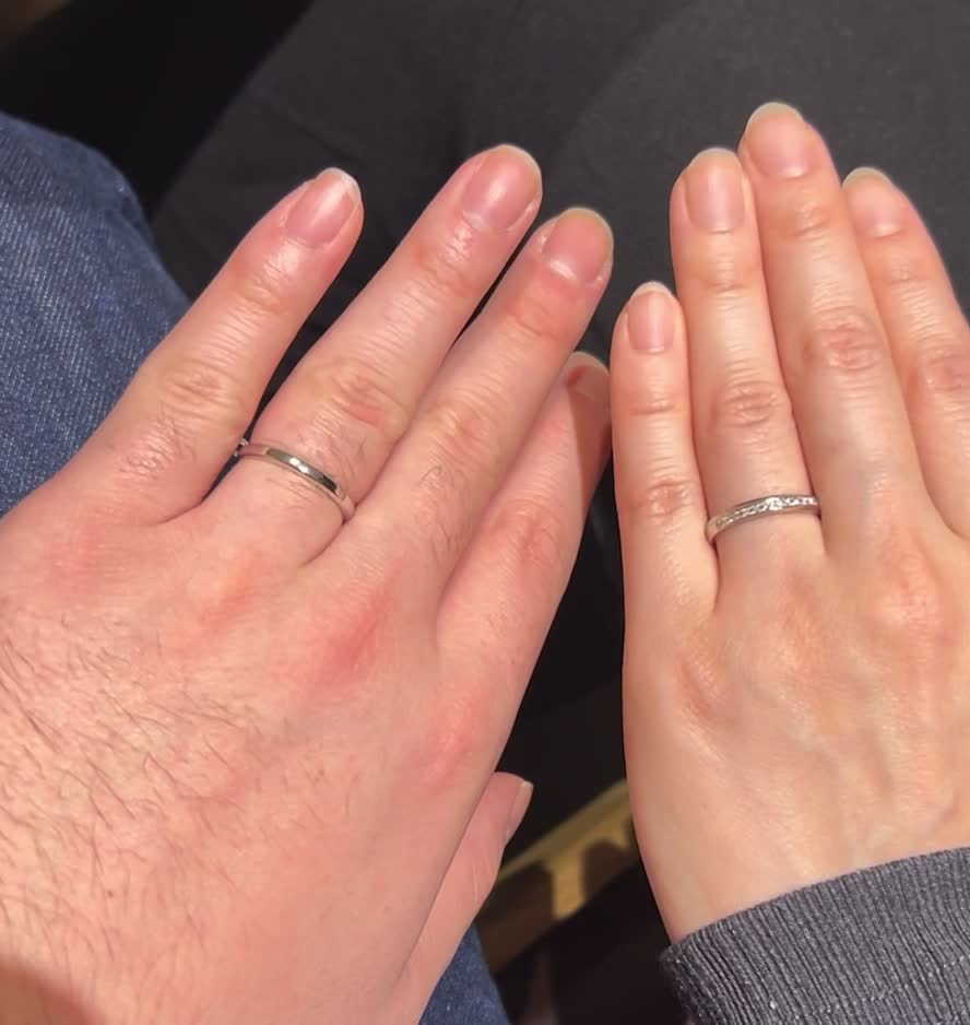 とにかくシンプルでとても気に入りました。男性と女性の指輪のモチーフが異なっていても基本のデザインが大きく変わらないので、どれを組み合わせても良いなと感じました。付け心地もよく長くつけ続けられる点も魅力でした。