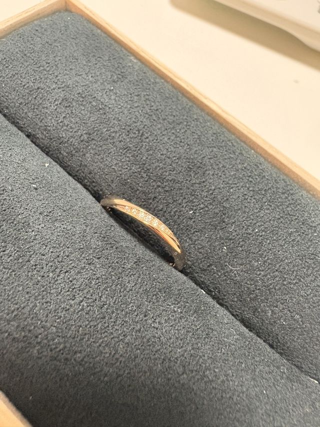 指輪のリング自体はシンプルで着け心地が良いです。そこに、テーマに合わせた風になびくようなラインで石が埋め込まれている所がこの指輪の素敵なポイントだと思います。色味についても、悩んだ結果ピンクゴールドを選択しましたがピンクが強く主張される訳でもなく程よい色味なのもお気に入りです。