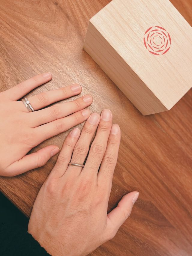 2人が出会った地に縁のある指輪だったので決めさせて頂きました!デザインも複数ありとても迷いましたが、元々良いと思っていた光結を選ばせて頂きました。画像で見るのと実際に見るのとでは、良い意味で印象がかなり違いました。