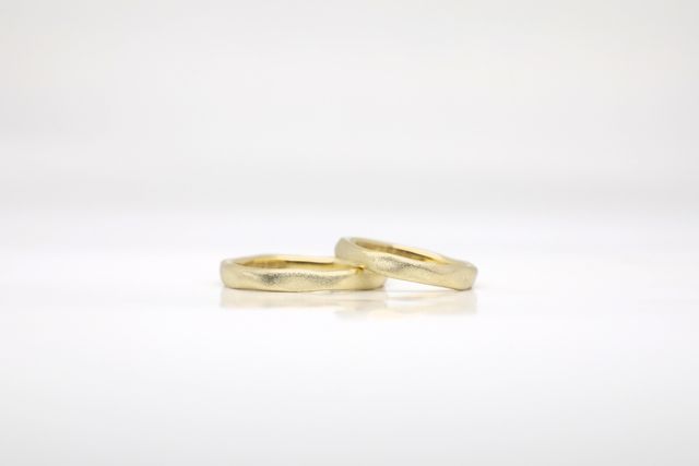 グリーンゴールドという普段目にしない素材を選ぶことができました。また、普段の付け心地を考慮して、角のない丸みの帯びた曲線のデザインにしました。さらにゴールド系を選んだので、派手になりすぎないように艶消し加工もしてもらいました。
