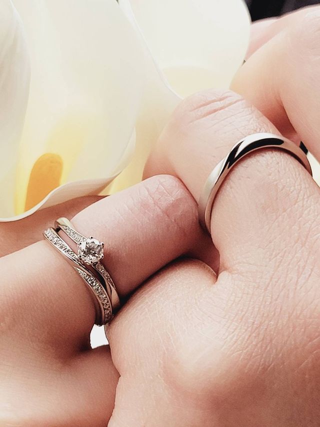 ふたりの間に流れる緩やかな気持ち- 指がきれいに見えるS字ラインに拘ってるデザインであり婚約指輪との重ね付けにも自然と合うデザインなのが妻のお気に入りで、自分の方もマット加工された部分と普通のツヤあり部分と二通り楽しめるのが気に入って選びました!
