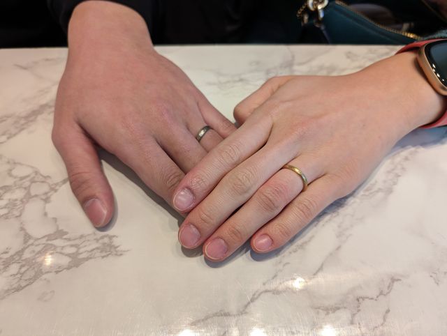 有名ブランドでプラチナの指輪にするか、とても迷いましたが、私達は仕事ではつけられないため、休みの日に付けたくなる、今の自分たちの気に入ったデザインを重視して、こちらを選びました。手作りで、温かみがあるのがとても良いなと思いました!