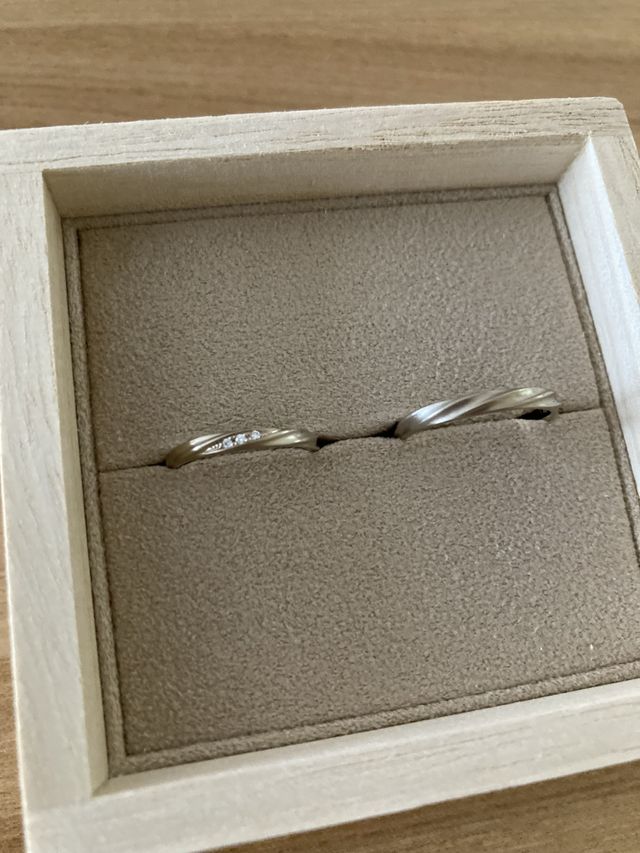 【流れ】をイメージした指輪で、個性的な彫刻があまり他の人と被らなさそうだな…と思いました。ホワイトゴールドのマットな質感が、あまりキラキラしておらず2人の指にもしっくりきました。普段の服装にも合いそうなので良かったです。