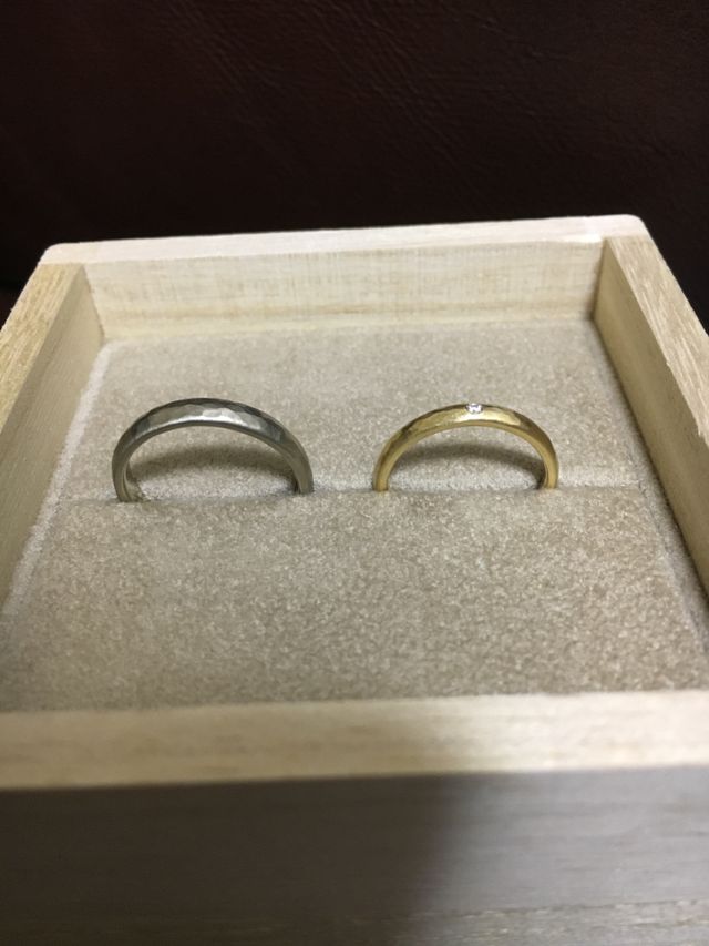 彼とは、全然好みが合わないんです。ただ、この指輪の出会いは、運命だなーと思いました。ブライダルフェアーの帰りに、買い物しようとふらっとお店の前のYUKAHOJOさんのポスターをみました。まだ指輪を買う予定もなかったんですけど、可愛いなーと思ってたら彼が、見るだけ見る?と。実物を見せてもらったら、俺もこの指輪をつけたいと言ってくれて、式も決まってないのに←、一目惚れで翌月に購入しました。その後に2ヶ月ちょっとで届きました!