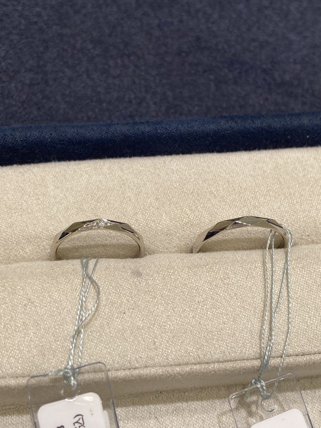 デザインが個性的で、一目見たときから惹かれました。カットが多いので、キラキラして見えるので、目立つし綺麗だと思います。価格は2人合わせて10万以内を予定していましたが、デザインに惹かれ、購入を決めました。