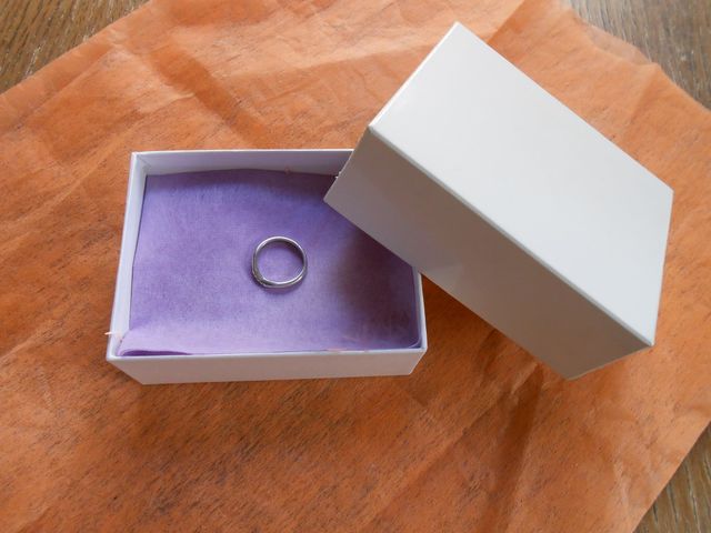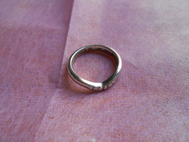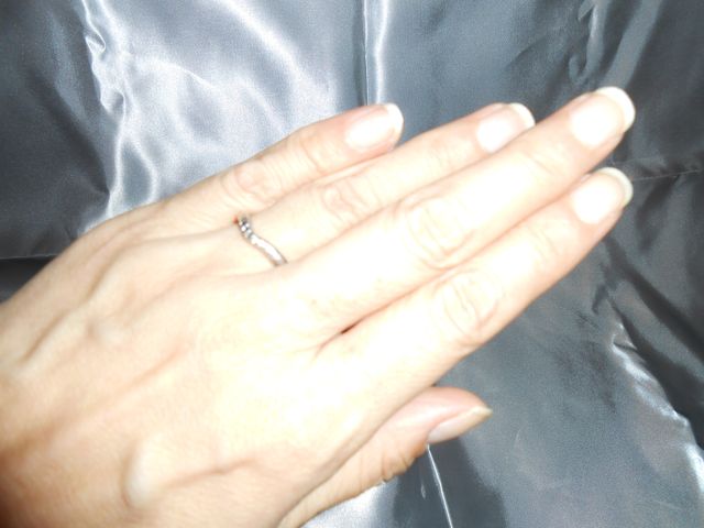 プラチナ素材でVラインにメレダイヤが入っているのが斬新で一目見て気に入りました。やや細めな結婚指輪ですがシンプルな中にもデザイン性があり、他の石の入ったリングと重ね合わせた時にVラインに収まって一体化します。