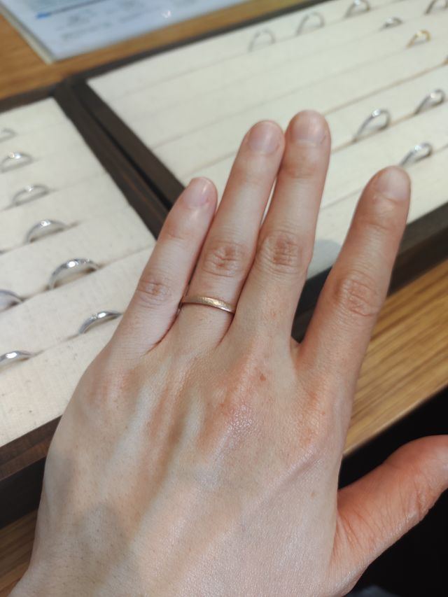 シンプルで落ち着いた印象のピンクゴールド。リングの幅も太すぎ細すぎない。マット加工で更に落ち着いた印象に。手作り感があり、より愛着が持て普段使いに良さそう。価格も凄くリーズナブルなのでペアリングとして製作するのもオススメだと思う。