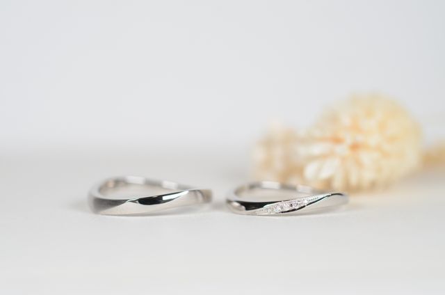 プラチナで、ウェイブしたベースの形にひねりを加えたデザインです。横の部分にはヘアラインが入っていていますが、メイン部分は鏡面にして残すことでアクセントとしました。シンプルだけど、つけていてうれしいと思えます。