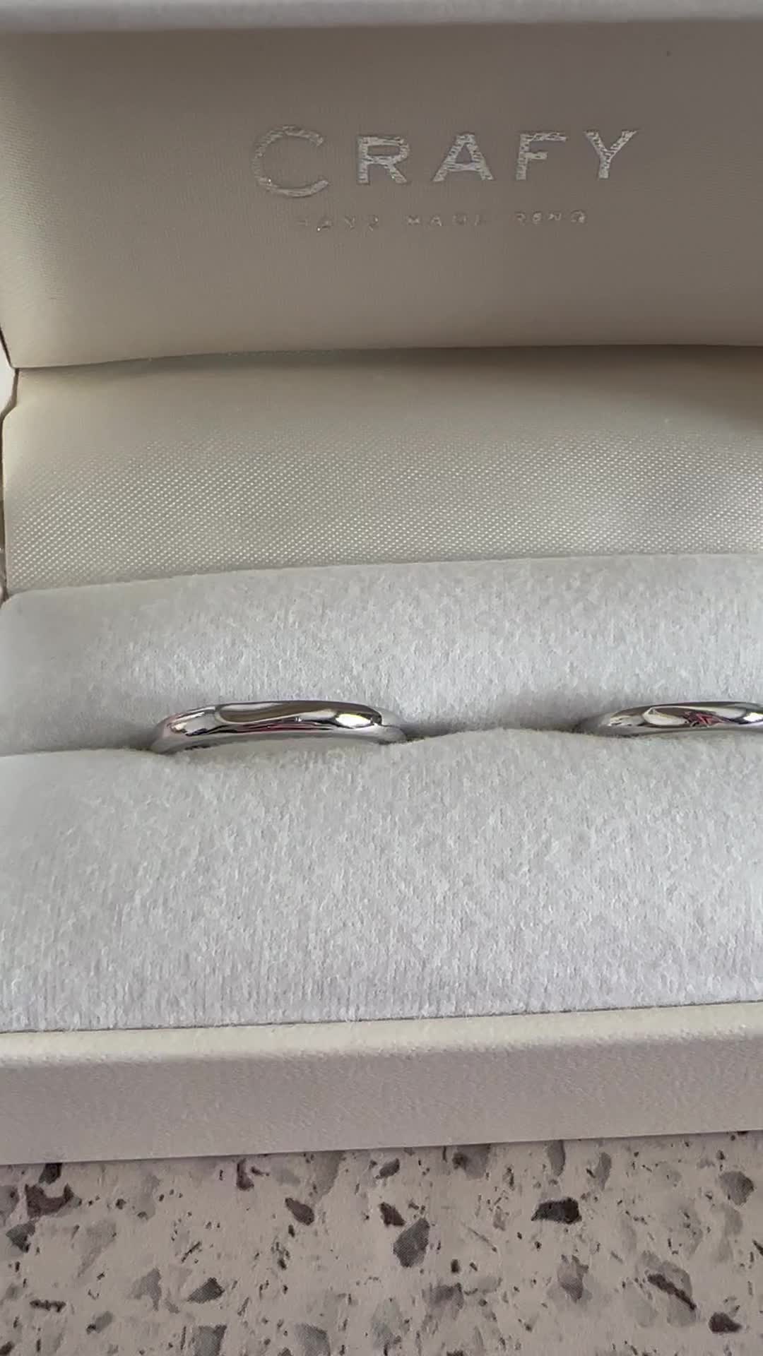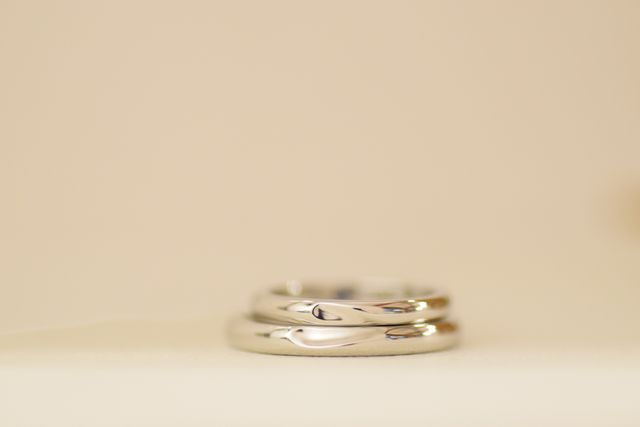 プラチナの輝きが綺麗です。シンプルでスタイリッシュですが、ちゃんとオリジナリティとペア感があるデザインにこだわりました。自分達で掘りの部分もマーキングして削り出したので、世界に一つの指輪なのが何より嬉しいポイントです。