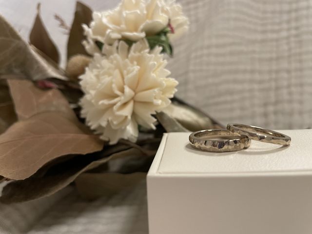 普段使いしやすいシンプルな作りにしたく、ホワイトゴールドをチョイスしました。2人とも半分は槌目デザインにして、お揃いのデザインに。私は残り半分の中央部にダイヤを3粒施したので、輝きが増し手が綺麗に見えて大満足です。