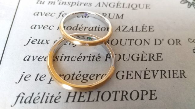 プラチナとイエローゴールドのコンビネーションにしました。半分ずつ素材が違うので、気分によって見える部分を変えられるのが魅力。