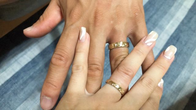 スウィート10で結婚指輪を作り直すことにしたので、今回は前回プラチナにしたが結局歪んでしまったので、好きな金属を選ぶことにして、24Kを希望して行ったが24Kにすると歪むので、14Kにして少しでも強度がある方を選んだ。丸みがあるハワジュが多かったので、平らにした。
