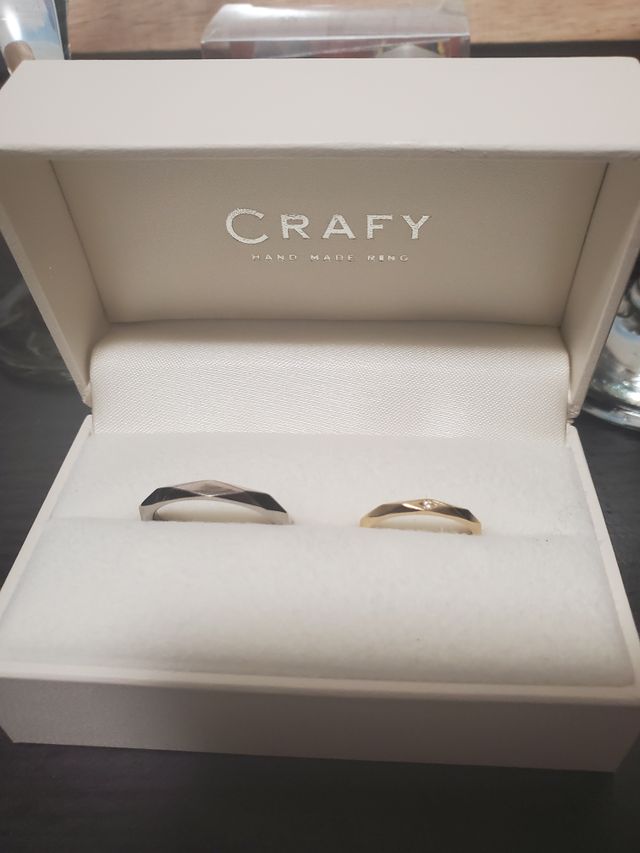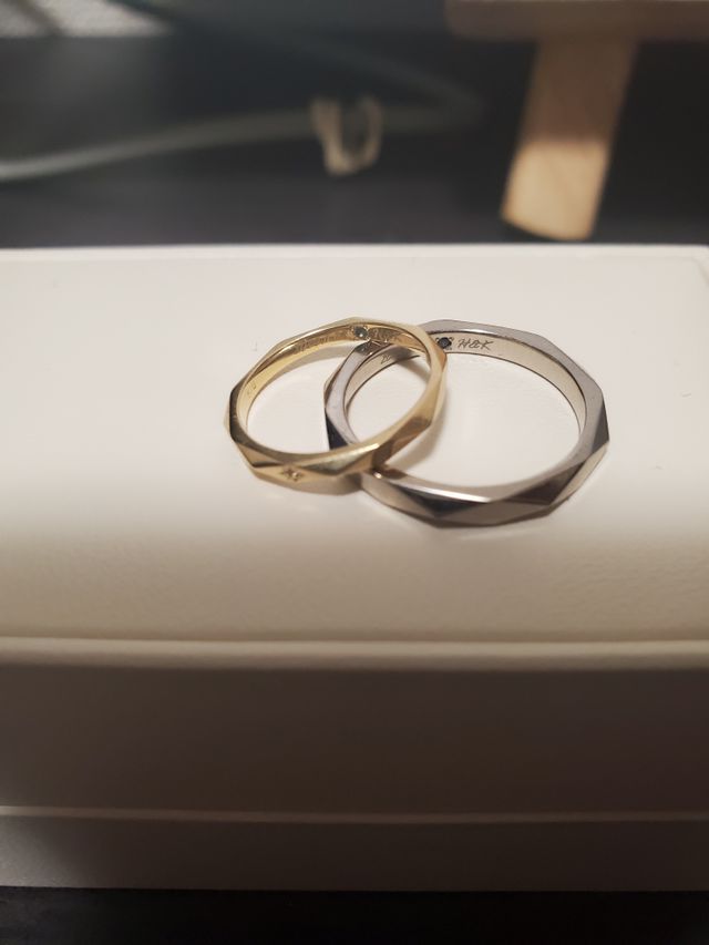多面体デザインはあまり着けている方を見ないので決めていました。素材もゴールド系でざっくりと決めていましたが、店舗にはいろいろなゴールドの種類があり悩みましたが様々なサンプルを見て二人のデザインは統一し、素材をイエローゴールドとブラックゴールドに決めました!