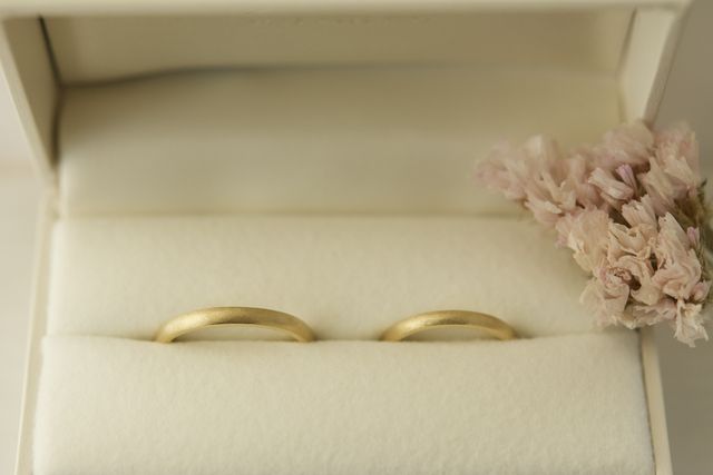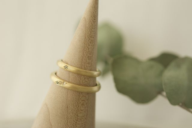 ゴールドでマットな加工のみのシンプルなものと決めていきました。マット加工やゴールドにも種類があり、自分たちの肌の色にあった組み合わせを選ぶことができました。宝石がサービスでつくと伺い、入籍記念日の11月の誕生石ブルートパーズを入れました。宝石の入れ方もたくさん種類があって、選ぶのが楽しかったです。シンプルな物にしたかったので、掌側に石がくるようにつける予定でしたが、実際に届いたものを見ると、小さめな石に八光留めが可愛くて、外側にしてつけています。