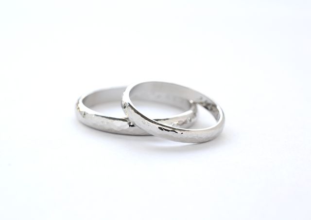 指輪のデザインは、できる限りシンプルなもの、仕事中つけていても気にならないようなデザインを求めていました。初めは普通のシルバーの指輪を希望しましたが、サンプルを見ていて表面に小さな凹凸があるデザインの輝きが気に入り、今回制作しました。