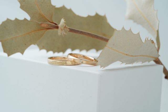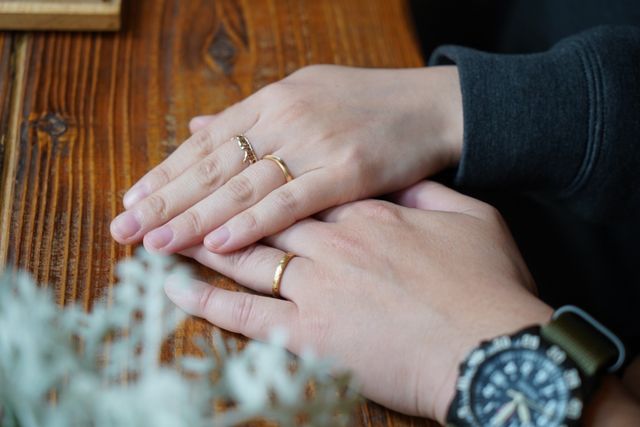 ゴールドとつや消しの加工は同じものにして、デザインは別々でお互いが好きなものにしました。