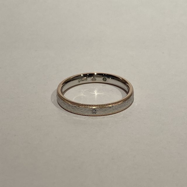 オーダーメイドなので、自分の希望を全て反映したリングが出来たと思います。何となく考えていたイメージに加え、表面のテクスチャや色味などを沢山の種類から相談し、好みの一本に仕上がりました。内甲丸で付け心地も良いです。ミル打ち部分の色味はレッドゴールドを選び、シンプルながらもアクセントの効いたデザインとなりました。