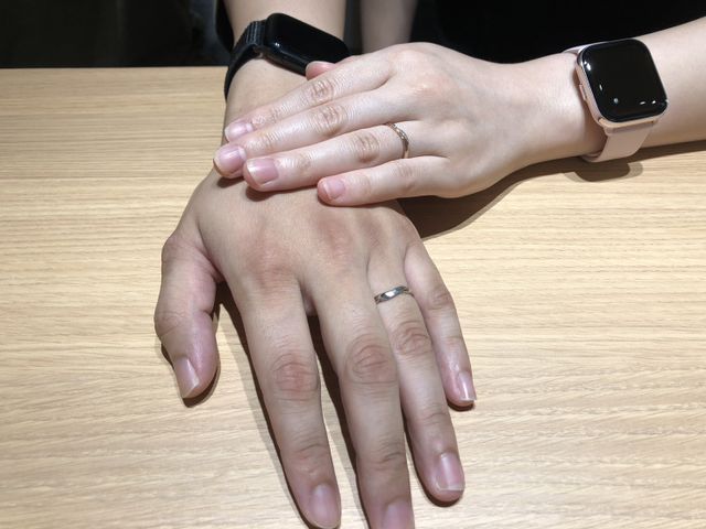 ウェーブのフォルムで指が綺麗にみえ、ダイヤが多く入っていることで特別感を感じられます。また、表面がぽこぽことしているデザインは、きれいめだけでなくカジュアルな雰囲気なときも似合い、私たちの雰囲気に合致しました。