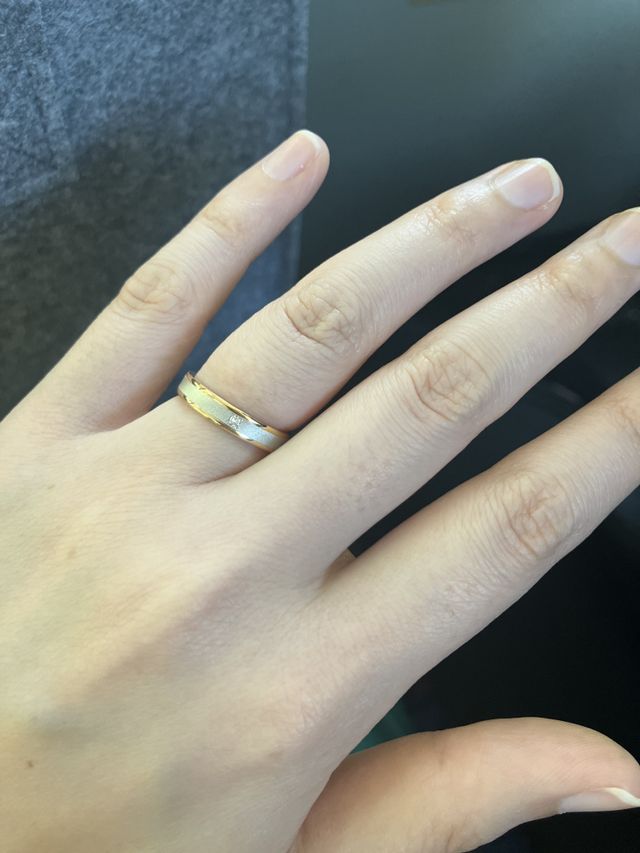 シンプルかつエレガントで、尚且つありそうでないデザインで特別感があり気に入ってます。特殊な加工とのことで、他の指輪のようにアフターケアを受けられない項目もありますが、数十年の記念日に結婚指輪を買い替えるカップルもいるとお聞きしたので、今後買い替えることも念頭に入れた上で、今気に入ったデザインの指輪を買うことにしました。