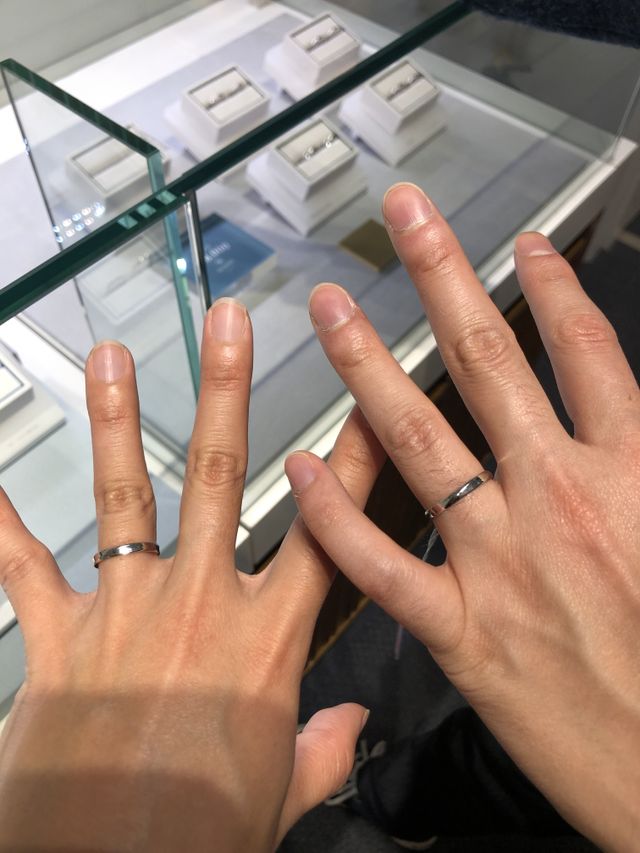 プラチナの指輪で価格を抑えたものを探していました。どちらかというと平たい指輪ですが、斜めにデザインが入っていて、立体感や指輪の幅の厚みを感じることができます。指輪自体は厚さは薄いので、装着時の重みなどは感じません。