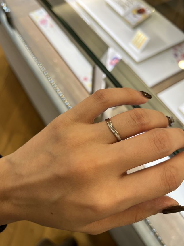 ホームページで先に拝見しており、実際に見てみたい!と思って来店予約を決めました。普段からリングは着けるのですが結婚指輪には絶対ダイアモンドが付いてるのが良いなと思っていたので実際見た時に凄く可愛くてキラキラしているのに心惹かれました。