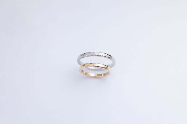 槌目のデザインに一目惚れしました!シンプルなデザインを希望していたため、店主にも相談してダイヤのないものに決めました。ツヤありとツヤなしを実際に比較させていただき、ツヤありで製作していただきました。槌目の模様が光っていてとても綺麗です!